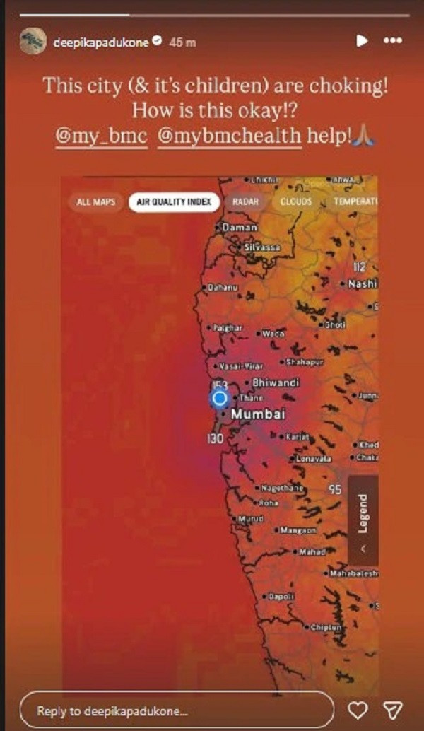 সম্প্রতি নিজের ইনস্টাগ্রাম স্টোরিতে একটি পোস্ট শেয়ার করেন দীপিকা। সেখানে ভারতের পশ্চিম উপকূলের একটি মানচিত্র তুলে ধরে মুম্বইয়ের বর্তমান বায়ুদূষণের চিত্র দেখান তিনি। ওই পোস্টে দেখা যায়, শহরের এয়ার কোয়ালিটি ইনডেক্স ১৫৩-এ পৌঁছেছে, যা স্বাস্থ্যের পক্ষে মোটেই নিরাপদ নয়। এই পরিস্থিতি নিয়ে উদ্বেগ প্রকাশ করে বৃহন্মুম্বই পুরসভার কাছে দ্রুত পদক্ষেপের আবেদন জানিয়েছেন অভিনেত্রী। পরিবেশবিদদের মতে, গত এক বছরে মুম্বইয়ের বায়ুর গুণমান আরও খারাপ হয়েছে। সাম্প্রতিক সমীক্ষা অনুযায়ী, শহরের কিছু এলাকায় পরিস্থিতি অত্যন্ত উদ্বেগজনক। চলতি বছরের ফেব্রুয়ারিতেই ঘাটকোপার ও মুলুন্ডের মতো অঞ্চলে AQI প্রায় ২৩০ থেকে ২৫০-র মধ্যে ছিল, যা মারাত্মক দূষণের ইঙ্গিত দেয়।