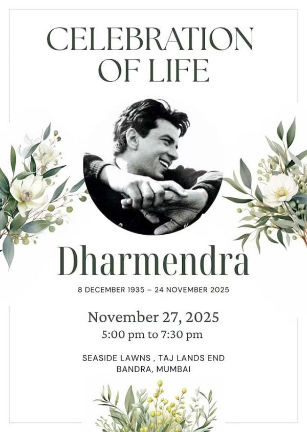 এদিন ধর্মেন্দ্রের পরিবারের পক্ষ থেকে একটি পোস্টার প্রকাশ করে এই খবর জানানো হয়। পোস্টারে দেখা যাচ্ছে বলিউডের ‘হিম্যান’-এর অল্প বয়সের ছবি, সঙ্গে লেখা রয়েছে ‘সেলিব্রেশন অফ লাইফ’। পোস্টারে উল্লেখ করা হয়েছে, বৃহস্পতিবার, ২৭ নভেম্বর মুম্বইয়ের একটি পাঁচতারা হোটেলে বিকেল ৫.৩০টা থেকে ৭.৩০টা পর্যন্ত ধর্মেন্দ্রের স্মরণসভা অনুষ্ঠিত হবে, যেখানে উপস্থিত থাকবেন তাঁর পরিবার এবং ঘনিষ্ঠ বন্ধুরা।