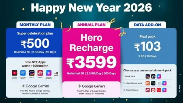 ১. Hero Annual Recharge: সংস্থা সূত্রে জানা গিয়েছে, বার্ষিক এই রিচার্জ প্ল্যানের খরচ ৩৫৯৯ টাকা। এতে পাবেন আনলিমিটেড কলিং, প্রতিদিন ১০০টি করে মেসেজ ও দৈনিক ২.৫ জিবি ডেটা। তবে এখানেই শেষ নয়। নতুন বছরের উপহার হিসেবে পাবেন বিনামূল্যে ১৮ মাসের জন্য জেমিনি প্রো ব্যবহারের সুবিধা। অর্থাৎ ৩৫, ১০০ টাকা খরচ না করেই ব্যবহার করতে পারবেন জেমিনি প্রো। পাবেন ২ টিবি পর্যন্ত ক্লাউড স্টোরেজও।