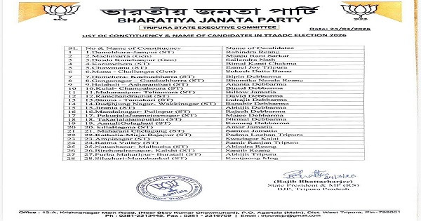 আগরতলা, ২৪ মার্চ : ত্রিপুরা ট্রাইবাল এরিয়াস অটোনমাস ডিস্ট্রিক্ট কাউন্সিল (টিটিএএডিসি) নির্বাচনের প্রাক্কালে বড়সড় পদক্ষেপ নিল বিজেপি। মঙ্গলবার সাংবাদিক সম্মেলনে দলের রাজ্য সভাপতি তথা সাংসদ রাজীব ভট্টাচার্য ২৮টি আসনের প্রার্থীর নাম আনুষ্ঠানিকভাবে ঘোষণা করেন।সাংবাদিক সম্মেলনে উপস্থিত ছিলেন মুখ্যমন্ত্রী প্রফেসর (ডাঃ) মানিক সাহা। এছাড়াও উপস্থিত ছিলেন মন্ত্রী প্রণজিৎ সিং রায়, প্রাক্তন সাংসদ রেবতি ত্রিপুরা এবং বিজেপি-এর সাধারণ সম্পাদক বিপিন দেববর্মা। প্রার্থী তালিকা ঘোষণা করে রাজীব ভট্টাচার্য বলেন, দল উন্নয়নমুখী ভাবনা এবং সংগঠনের শক্তিকে সামনে রেখে প্রার্থী নির্বাচন করেছে। প্রতিটি প্রার্থীই নিজ নিজ এলাকায় সক্রিয় এবং মানুষের সঙ্গে নিবিড়ভাবে যুক্ত বলে তিনি দাবি করেন।
